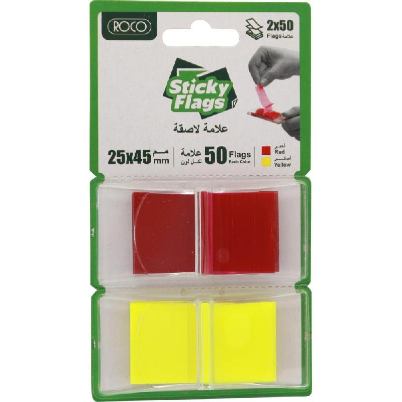 شريط لاصق بألوان حمراء وصفراء، مثالي لوضع إشارات سريعة على الصفحات المهمة. يحتوي على 100 علامة لسهولة الرجوع إلى المعلومات.